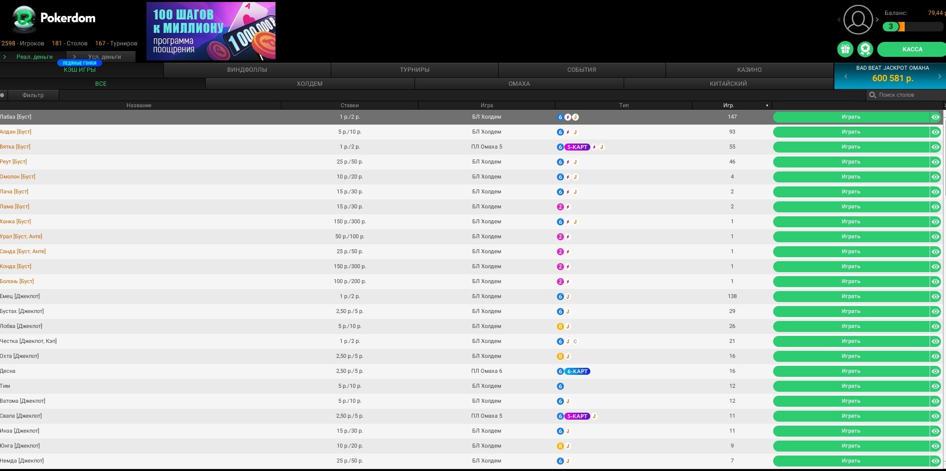 Лобби Pokerdom в разделе кэш-столов