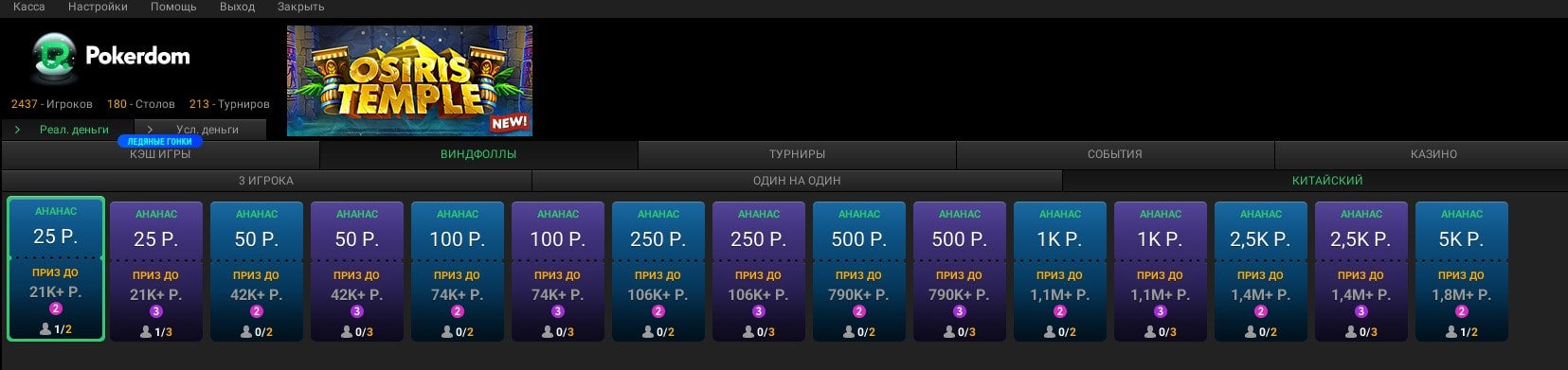 Китайский. Да-да, поиграть в спины в Pokerdom можно и в китайский ананас. Есть турниры на двоих и троих человек.